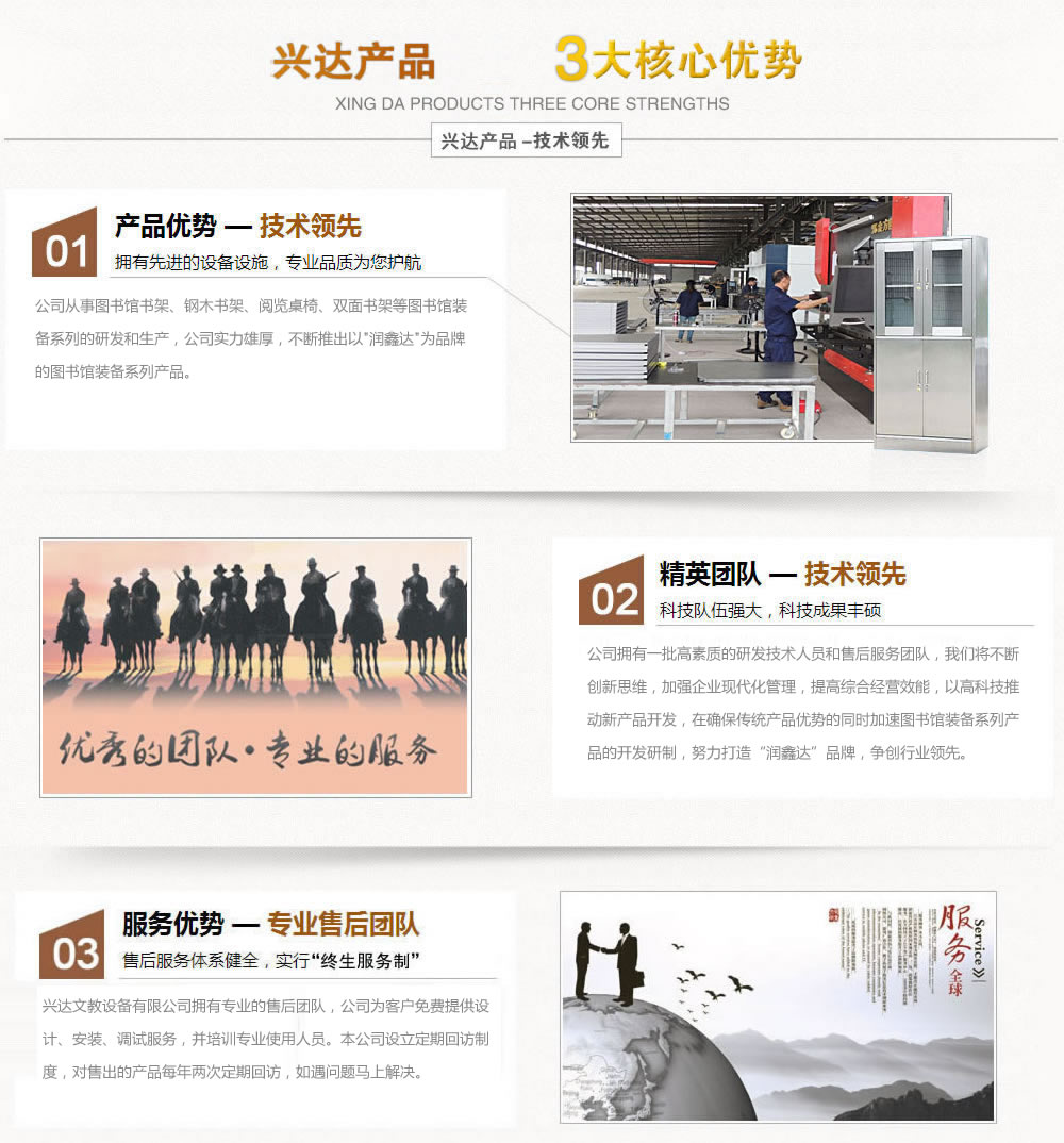 煙臺(tái)興達(dá)文教設(shè)備有限公司專業(yè)從事圖書館書架鋼木書架閱覽桌椅雙面書架等圖書館裝備系列以及存包柜系列、圖書防盜系列的研發(fā)和生產(chǎn),公司實(shí)力雄厚,擁有一批高素質(zhì)的研發(fā)技術(shù)人員和售后服務(wù)團(tuán)隊(duì),將十余年的專業(yè)生產(chǎn)經(jīng)驗(yàn)和市場(chǎng)需求緊緊相扣,不斷推出以"潤(rùn)鑫達(dá)"為品牌的圖書館裝備系列產(chǎn)品,贏得了全國(guó)各地用戶的信賴和一致好評(píng)。
